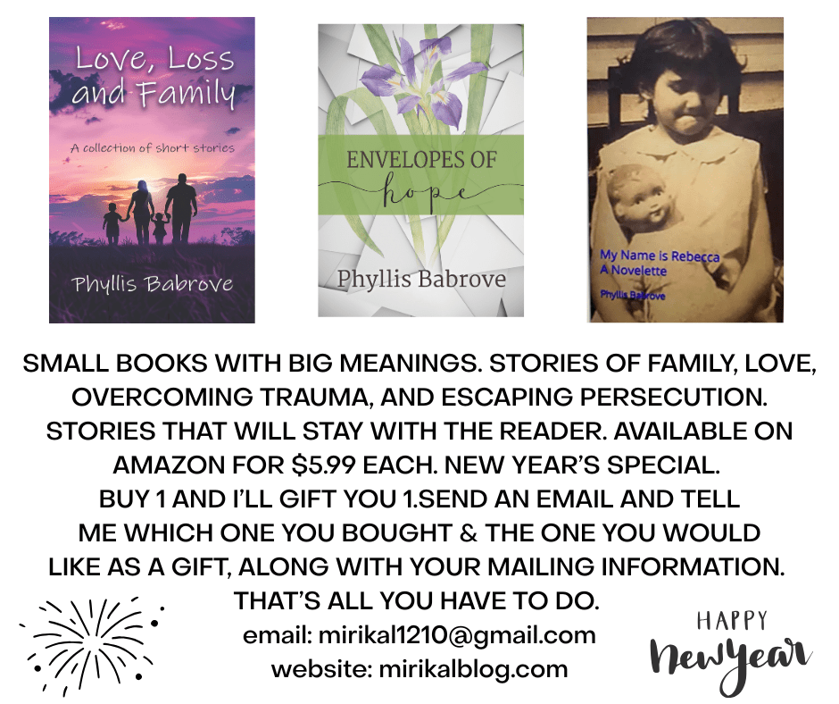 Welcome to Mirikal Books. You can read more about me under the “About Me” page. If you like contemporary fiction, historical fiction, and self-help books, you will like my writing. Learn about my books on the “My Creations” page. Do you enjoy a good short story? I’ve had two published and both are on the “Short Stories” page. I’m always doing giveaways, free gifts, and drawings. Just subscribe to this website and you’ll be notified when there’s a new post. My books are all available on Amazon in both e-book and paperback formats.