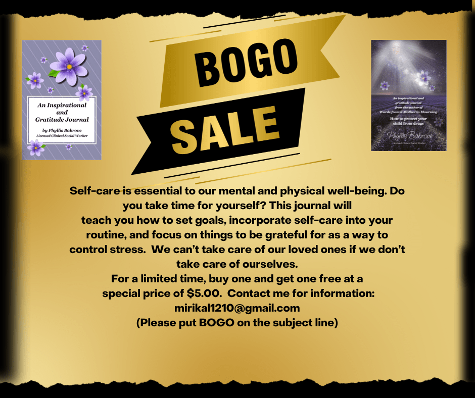 If you would like to chat with me via face time or phone, please send an email and we can set up a time. On the subject line, put “chat” so that I don’t miss it. I’m looking forward to meeting with you soon and to helping you on your journey to be a happier you.Just published–a journal to help you on your journey to find peace and happiness in life. Available on Amazon. “Twelve days before the World Health Organization declared Covid 19 as a worldwide pandemic, the author lost her daughter to a fentanyl overdose. Over the course of the next year and a half, Mrs. Babrove developed a website and wrote a book to help educate parents about drugs, prevention, interventions, and resources. A clinical therapist, the author’s newest creation is a daily journal to help people deal with the stress that has become widespread since the beginning of the pandemic, for those who have suffered loss, and for anyone who wants to find peace in their life.” $6.99
